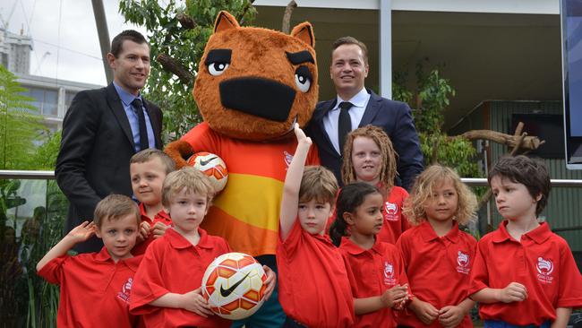Winners of a nationwide socceroos mascot design competition, during a training session of the socceroos team in gosford, may 18, 2014.